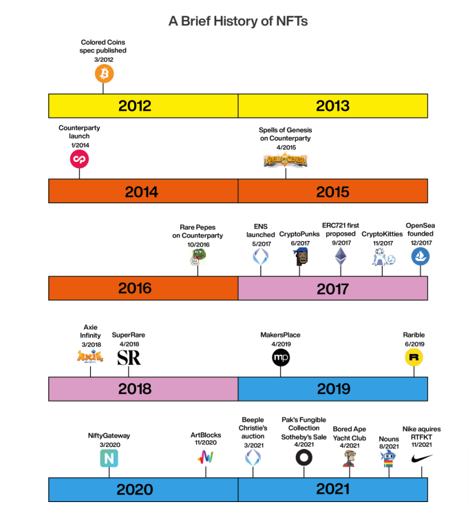 El arte digital hace tiempo que existe pero ha estado relegado a un segundo plano por los guardianes del mercado del arte, la facilidad de copiar archivos y la dificultad de autentificar la originalidad de una obra tampoco ayudaban a entrar en el circuito comercial. Con la tecnología blockchain todo está cambiando: desde 2013 existen creaciones “artísticas” que buscaban identificar obras digitales con un token único en la cadena de bloques: Colored Coins, Rare Pepes y CryptoKitties fueron los precursores del gran fenómeno que hoy llamamos NFTs, o “non fungible tokens”.