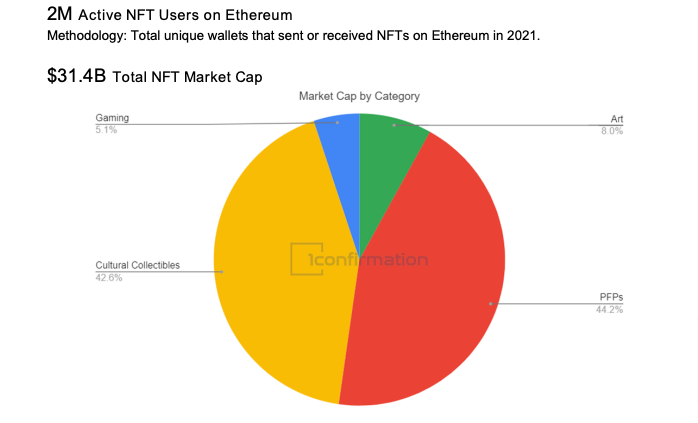 El mercado NFT es poliédrico, con muchas facetas que analizar, el informe sobre el rendimiento anual de las ventas NFT, realizado por 1Confirmation, ha analizado la red Ethereum, la más popular, y estima en 31 billones el mercado de los NFTs, y de ahí, extraemos que el arte NFT representa el 8%, o sea unos 2B de dólares. Las comparaciones son odiosas pero todo el mercado del arte español facturó unos 308M de euros en 2020. Si los NFTs son un cuento, habría que analizar seriamente qué ocurre en nuestro mercado, o más bien, tomar nota para subirse a este nueva tendencia, y aprovechar nuestro potencial creativo: actualmente contamos con artistas digitales muy cotizados internacionalmente.