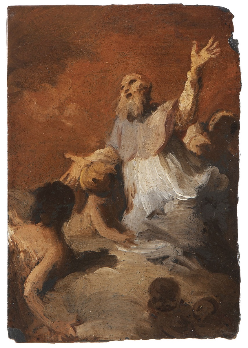 La aparición de este pequeño esbozo de Goya nos demuestra la fuerza inventiva del joven pintor durante su estancia en Italia de 1769 a 1771. Muy importante para confirmar la atribución a Goya es la comparación con dos dibujos del Cuaderno Italiano: el nº33 “Dios Padre apareciéndose a Abraham”, sanguina, donde el pequeño ángel sosteniendo la pierna de Abraham es igual al niño de debajo del brazo derecho del santo; también con el nº 55 “Muerte de Absalón”, lápiz negro, donde se ven los brazos abiertos de la misma manera que en este esbozo. Quizá más sorprendente es la comparación de los brazos alargados y de las manos grandes de esta obra con las manos de la figura a la derecha del “Sacrificio de la hija de Jefté”, gran cuadro pintado hacia 1771-1774 al regreso de Goya de Italia. El soporte de pizarra es único en la obra de Goya, pero hay que pensar que durante su estancia en Italia el joven pintor disponía de pocos medios económicos y tenía que utilizar cualquier soporte, ya que en Italia no es tan raro pintar sobre pizarra como lo es en España. Es por tanto casi milagroso que este esbozo haya sobrevivido intacto hasta nuestros días. BIBLIOGRAFÍA consultada: -“El “cuaderno italiano”, 1770-1786 : Los orígenes del arte de Goya” / [Manuela B. Mena Marqués… et al.], 2 vol., Catálogo de la exposición celebrada en Madrid, Museo del Prado, 1994. -“Goya e Italia”, Catálogo de la exposición celebrada en Zaragoza, Museo de Zaragoza, 1 junio- 15 septiembre 2008, 2 vol, editado por Joan Sureda.