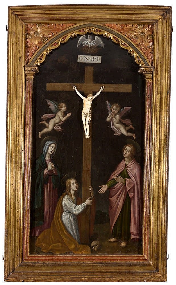 - LOTE 148: ESCUELA FLORENTINA S. XVI, Calvario. Óleo sobre tabla y Cristo de marfil tallado. 114 x 58 cm. Precio de salida: 7.000€ (30 de enero, Isbilya Subastas).