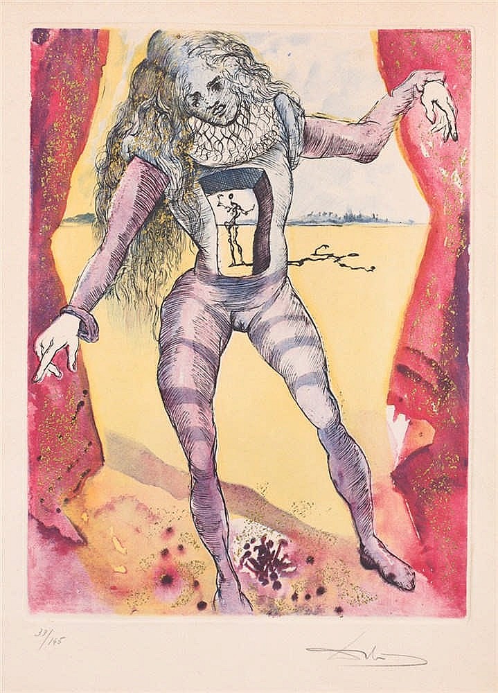 - LOTE 684: DALÍ, SALVADOR (1904 Figueras – 1989). Hamlet (Ser o no ser). Grabado al aguatinta y coloreado a mano sobre papel Arches. 56 x 40 cm. Precio de salida: 650€ (31 de enero, Isbilya Subastas).