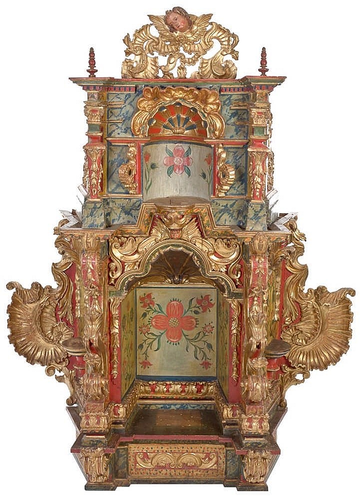 En cuanto a la sección de escultura sobre sale un San Antonio de Padua (54 x 19 x 19 cm) de Escuela Colonial del siglo XVIII. Está realizado en madera tallada y policromada, con atributos en plata. Posee permiso de exportación y saldrá a subasta por 12.000€ (ver). También dentro de la sección escultórica podemos ver un retablo barroco de Escuela mexicana, del siglo XVIII, de dos alturas formado por dos hornacinas para albergar tallas votivas enmarcadas por molduras doradas y rematadas por putis. La decoración polícroma es de época posterior, y está realizado en madera tallada. Saldrá a subasta por 15.000€ (ver).