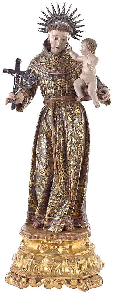 - LOTE 335: ESCUELA COLONIAL, S.XVIII San Antonio de Padua con el Niño. Madera tallada y policromada. 54 x 19 x 19 cm. Precio de salida: 12.000€ (30 de enero, Isbilya Subastas).
