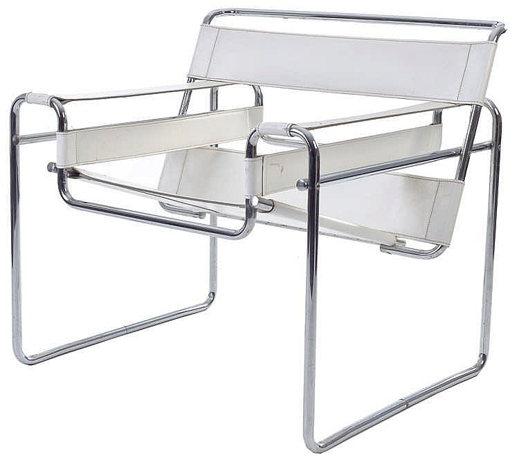 - LOTE 616: Silla Wassily en acero cromado y piel blanca. Según diseño de los años 70 de Marcel Breuer (1902-1981). 73,5 x 65 x 78 cm. Precio de salida: 300€ (30 de enero, Isbilya Subastas).
