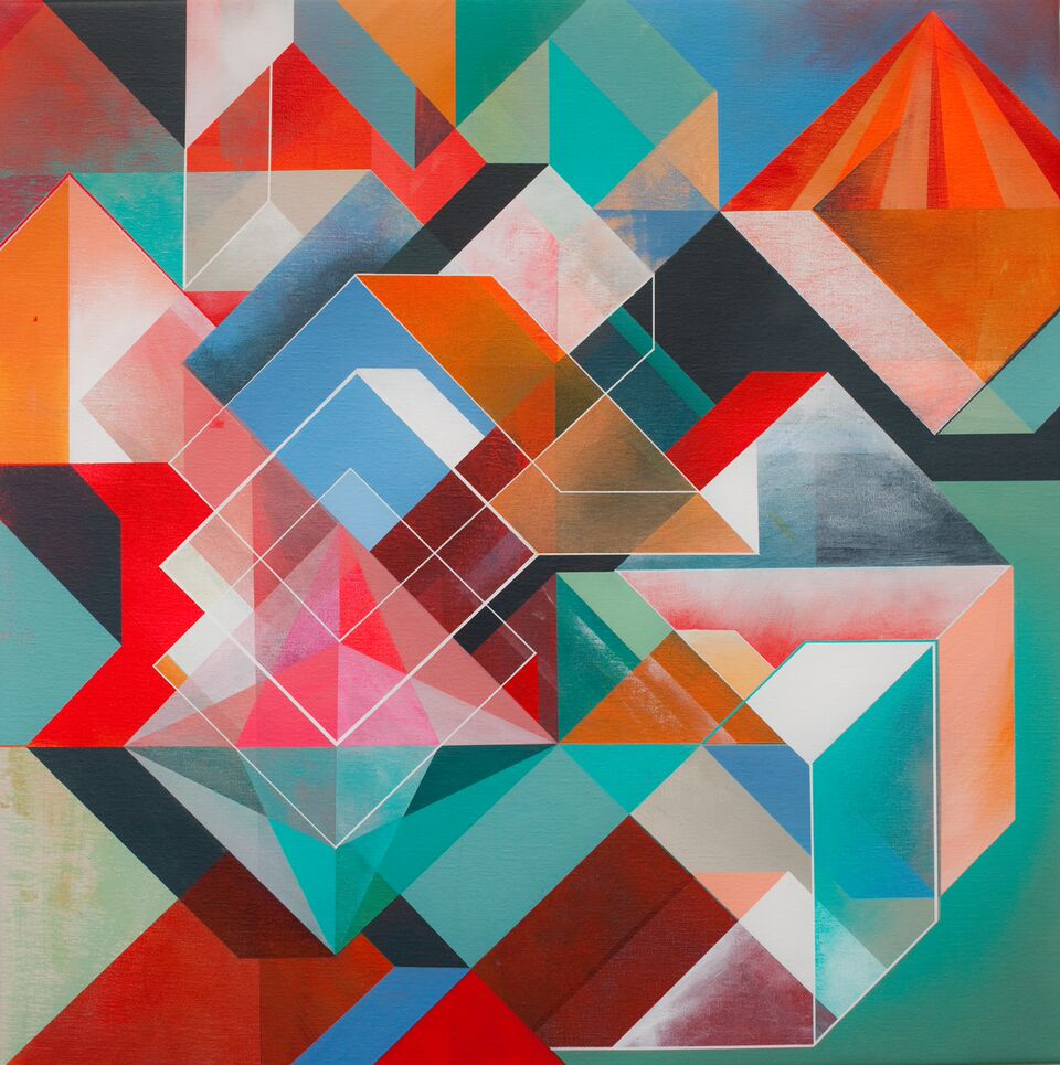 “En su obra, la abstracción geométrica y conceptual genera paisajes muy personales, jugando con el límite entre lo bi y lo tridimensional.”