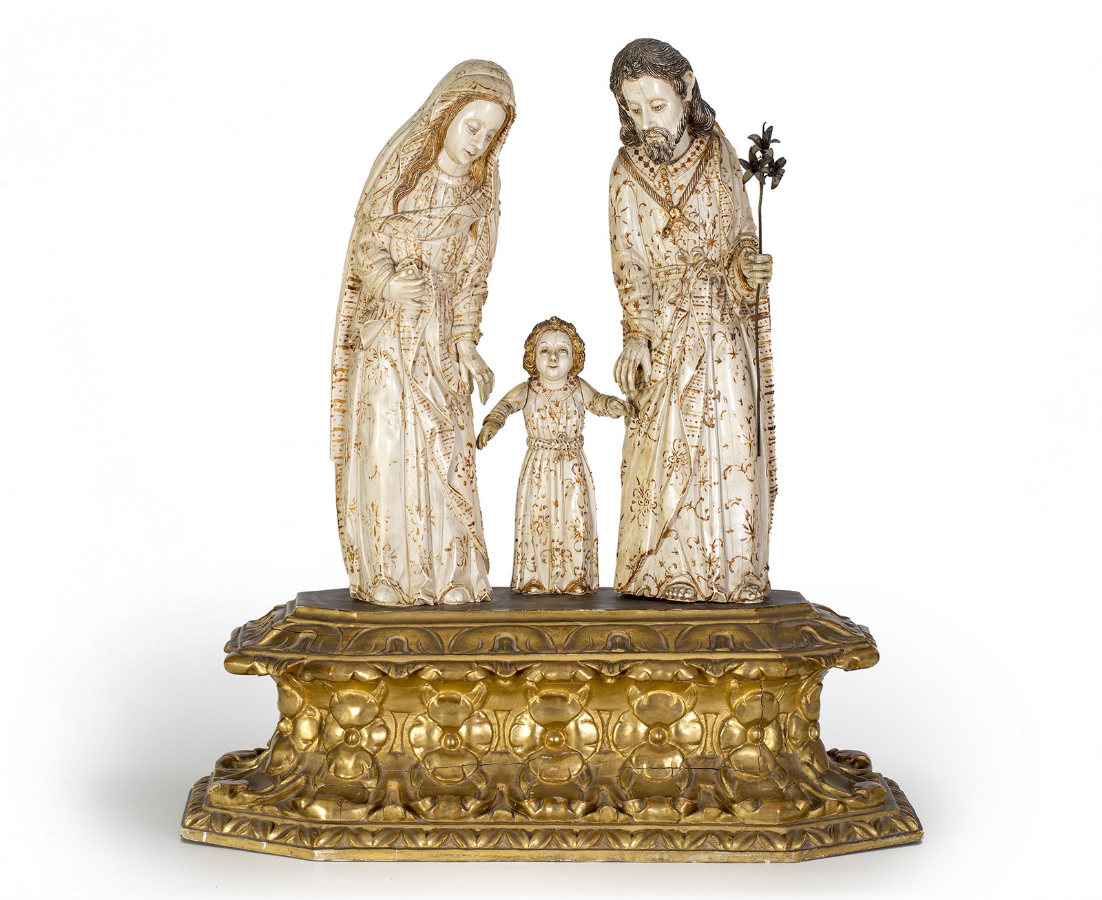 - ESCUELA HISPANO – FILIPINA. Sagrada Familia. Grupo escultórico en marfil tallado, policromado y dorado. S. XVII. Precio de salida: 80.000€ (Alcalá)