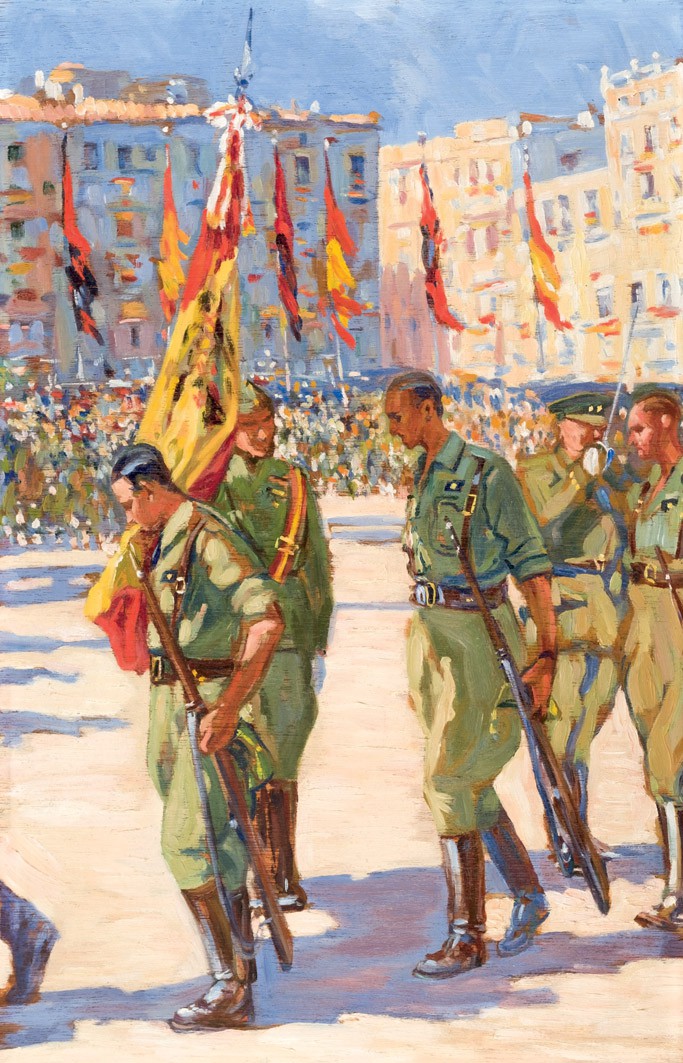 - BERTUCHI NIETO, MARIANO. La jura, la guerra y el entierro. Óleo sobre tabla en forma de tríptico. 55 x 129 cm. Precio de salida: 20.000€ (Durán)