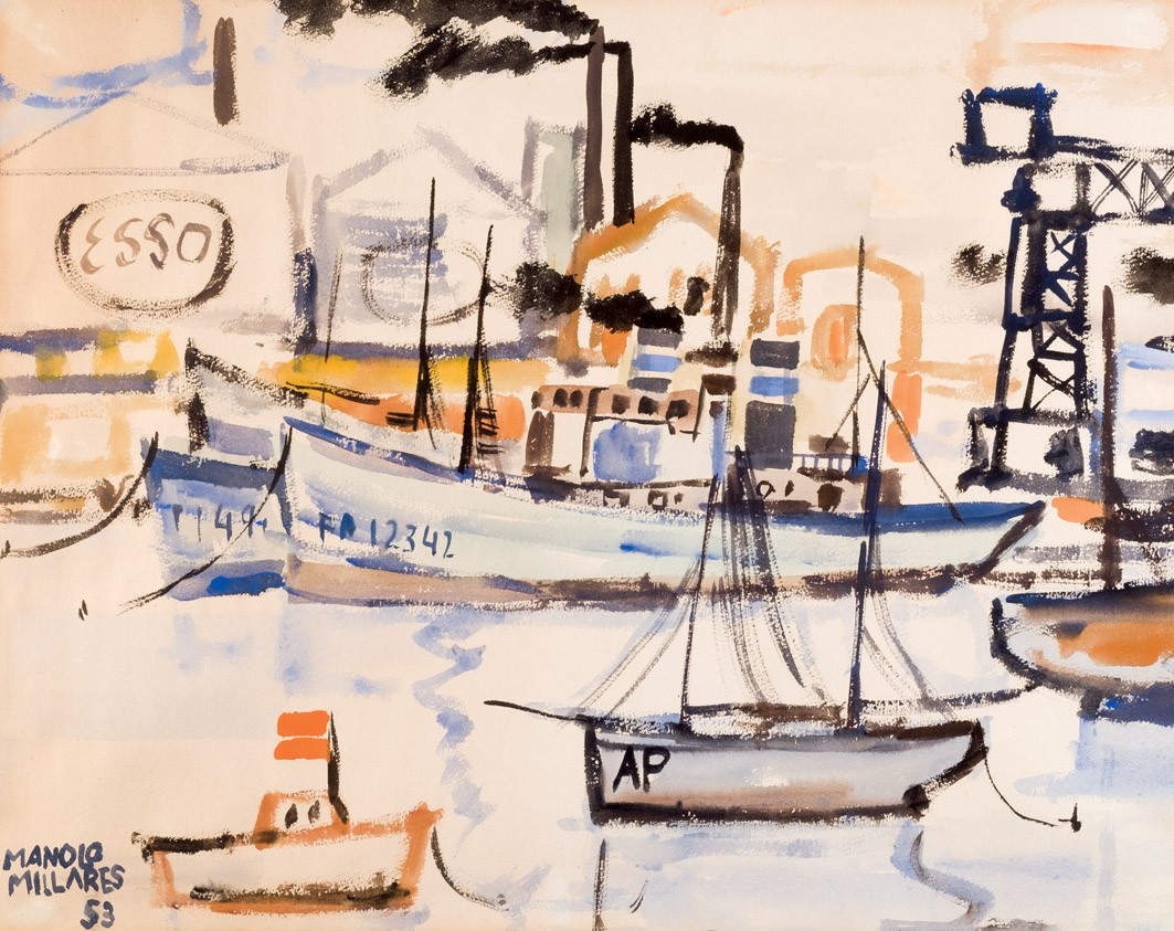 - MILLARES, MANOLO. El puerto. Acuarela sobre papel. 52,5 x 65,5 cm. Precio de salida: 10.000€ (Durán)