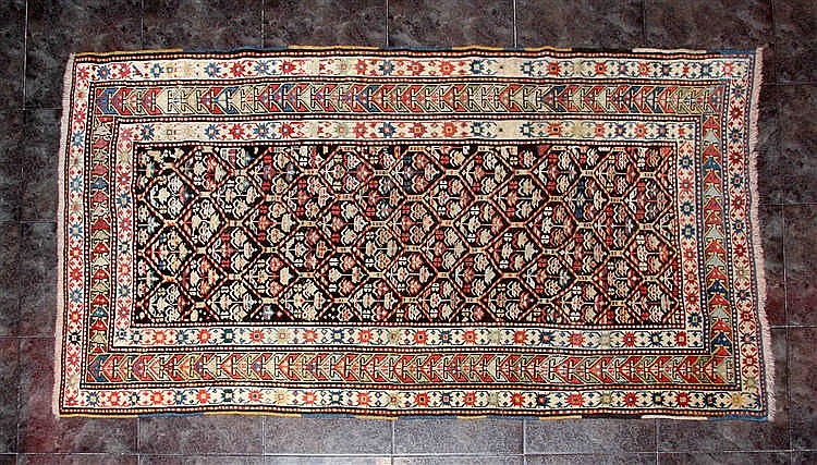 El siguiente lote, el 504, es una alfombra Shirvan (223 x 129 cm) en lana, con trama e hilos de urdimbre en lana. Procede de la región de Cáucaso, durante el segundo cuarto del siglo XX. El diseño en este caso es geométrico, en forma de tulipanes y enmarcado con tres colores diferentes y bordes. Los tintes, una vez más, son 100% naturales: azul índigo, marrón, crema, amarillo y negro. Sale a subasta por 3.500€ (ver).