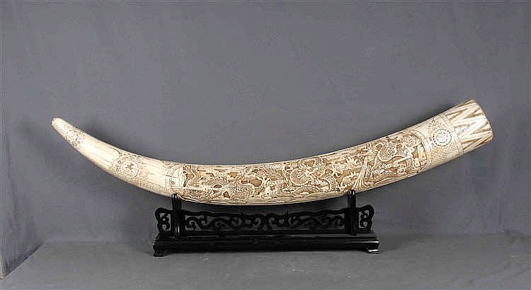 En cuanto a escultura, encontramos una pieza destacada, un Cristo yacente (13 x 41 x 24,5 cm) de autoría anónima, de entre el siglo XVIII y el siglo XIX. Está realizado en terracota policromada sobre una base de madera. Saldrá a subasta por 1.500€ (ver). Como muestra de los marfiles que encontramos en la subasta vemos este gran colmillo en hueso (153 cm de largo, aprox) tallado y policromado sobre peana de madera. La decoración está compuesta de dragones y motivos orientalizantes. Sale a subasta por 950€ (ver).
