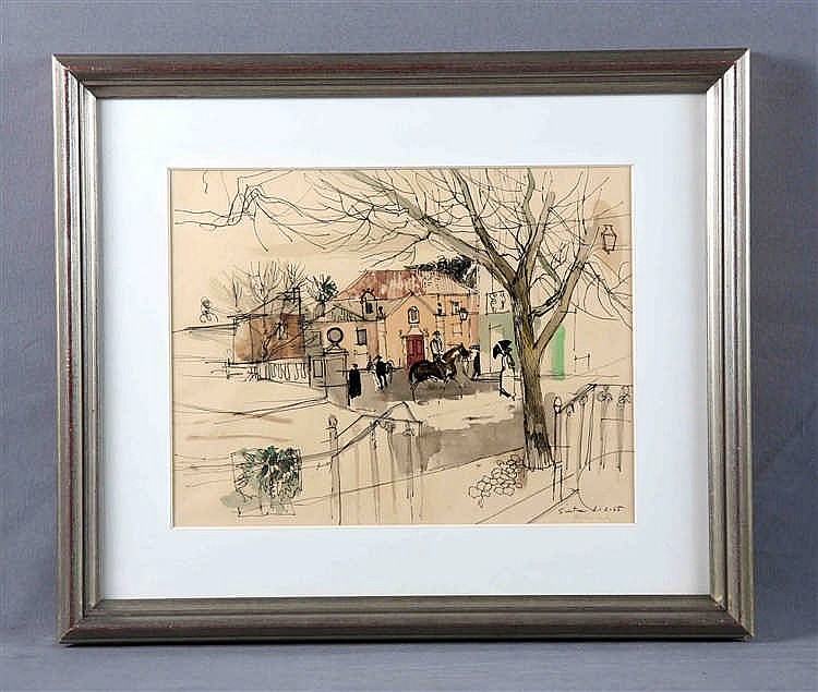 - GRAU SALA, EMILIO (1911-1975). “Escena urbana, Sintra”. Tinta y gouache sobre papel, de 33×41 cm.