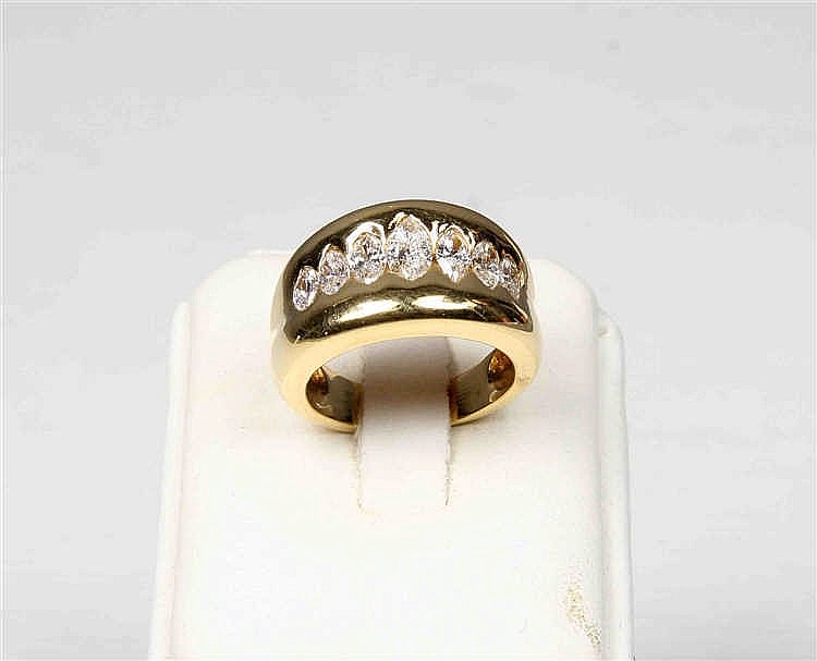 - Magnifica sortija con siete brillantes lanzadera, en montura de oro amarillo.