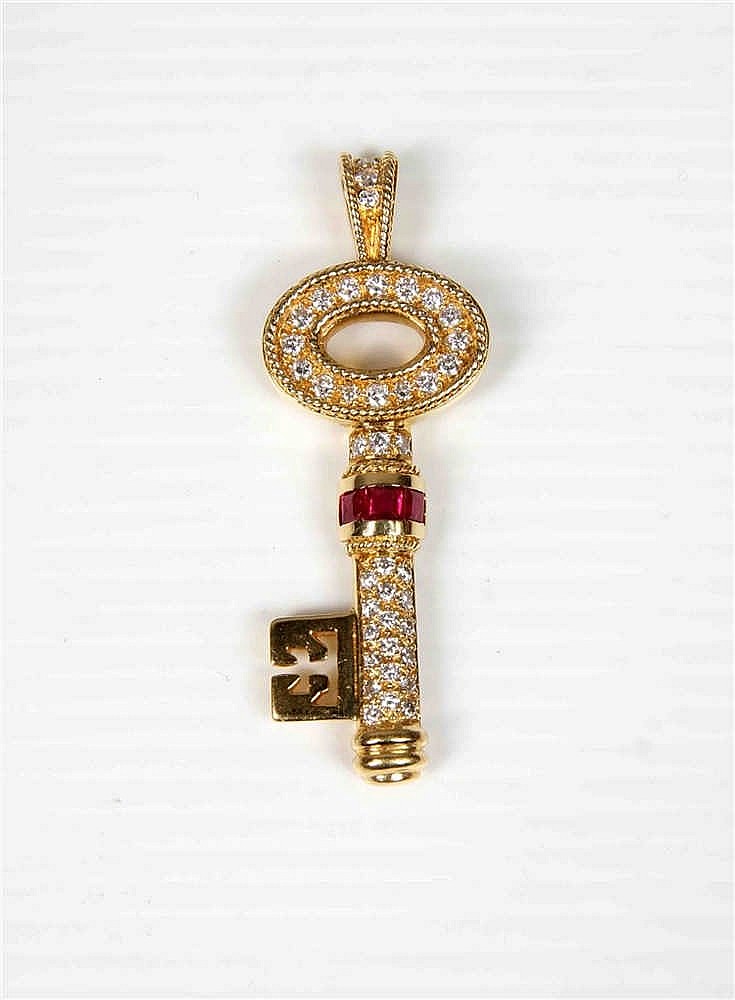 - Colgante en forma de llave, decorado con brillantes y rubíes, en montura de oro amarillo.