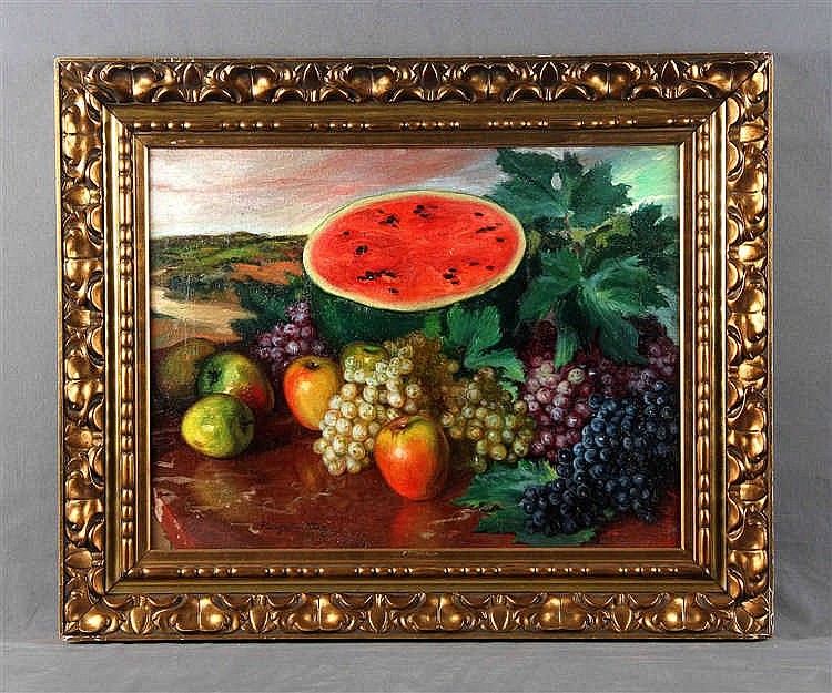 - PINAZO MARTÍNEZ, IGNACIO (1849-1916). “Bodegón de frutas”. Óleo sobre lienzo, de 48×63,5 cm