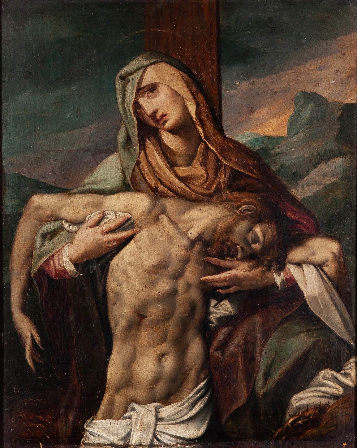 - ESCUELA ESPAÑOLA DEL SIGLO XVI. Piedad. Óleo sobre tabla. 32 x 27 cm. Precio de remate: 12.000€ (Goya)