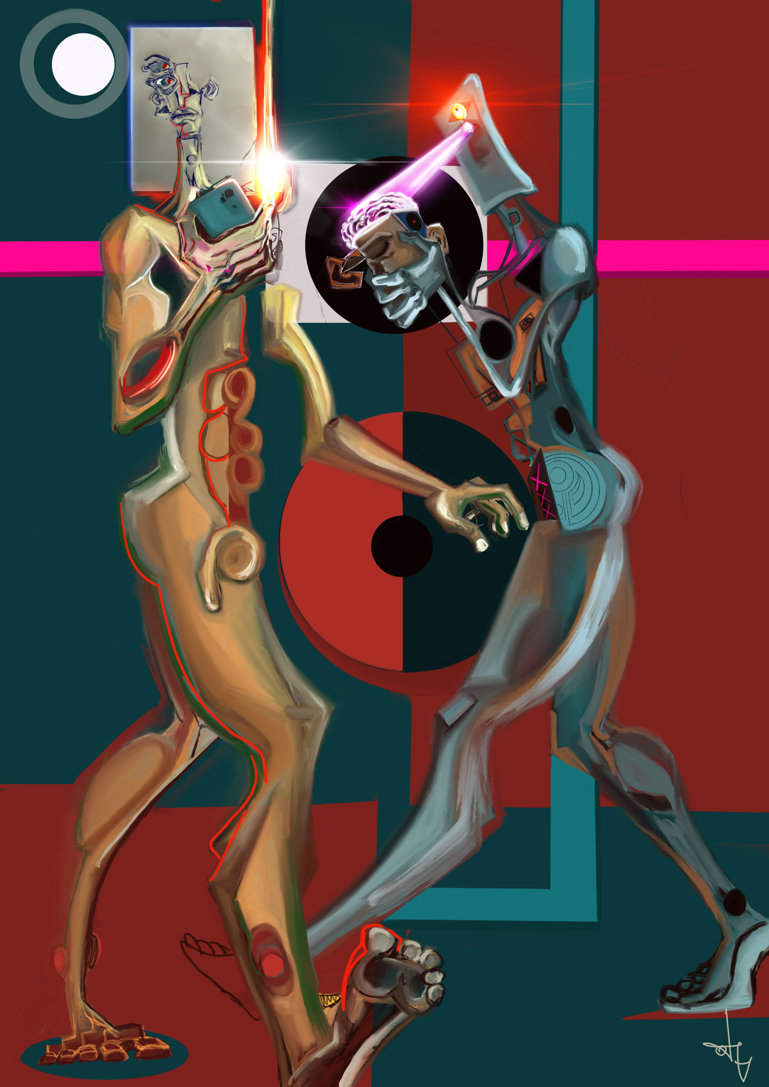 Que has querido representar en las obras.Presento dos…la primera de las obras habla sobre la dicotomía que se nos está presentando, actualmente, entre la tecnología y la IA y el ser humano, el cual está representado por el Titán Prometeo, utilizando la tecnología como herramienta, en contraposición al carácter casi religioso de los tecnólogos. Mirándose con desconfianza entre ambos y sabiendo que habrá que llegar a un entendimiento.