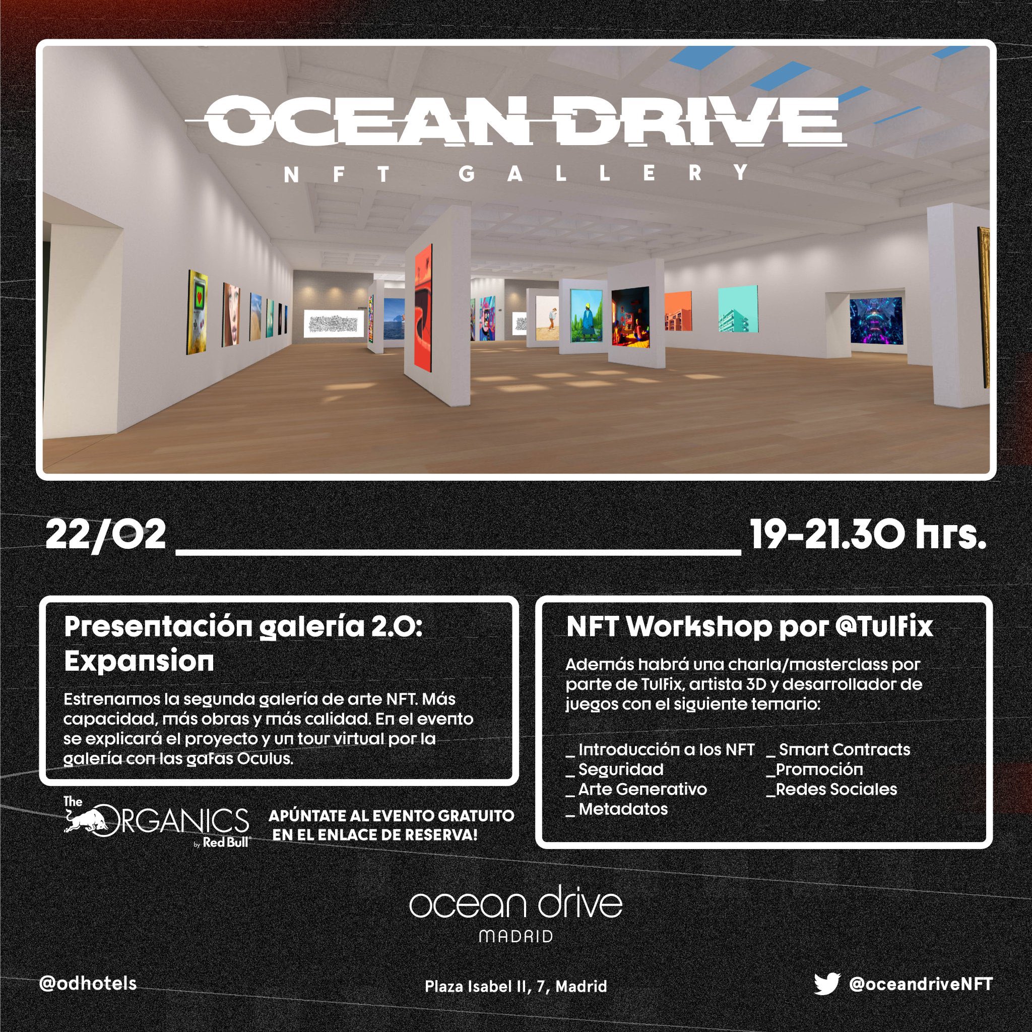 La presentación de la nueva galería se llevará a cabo en el hotel Ocean Drive Madrid, el 22 de febrero de 19 a 21:30, será una buena oportunidad de experimentar el criptoarte en Madrid, durante la Semana del Arte. En este link podéis registrar vuestra asistencia