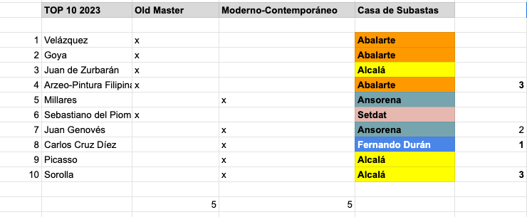 Las casas de subastas que han conseguido colocar más obras en este ranking han sido Abalarte y Alcalá, ambas con 3 obras vendidas en su sala, seguidos de Ansorena con dos obras, cerrando el ranking, Fernando Durán con 1, y Setdart, con otra. Es la primera vez que una “online” se cuela en el ranking de las 10 piezas.