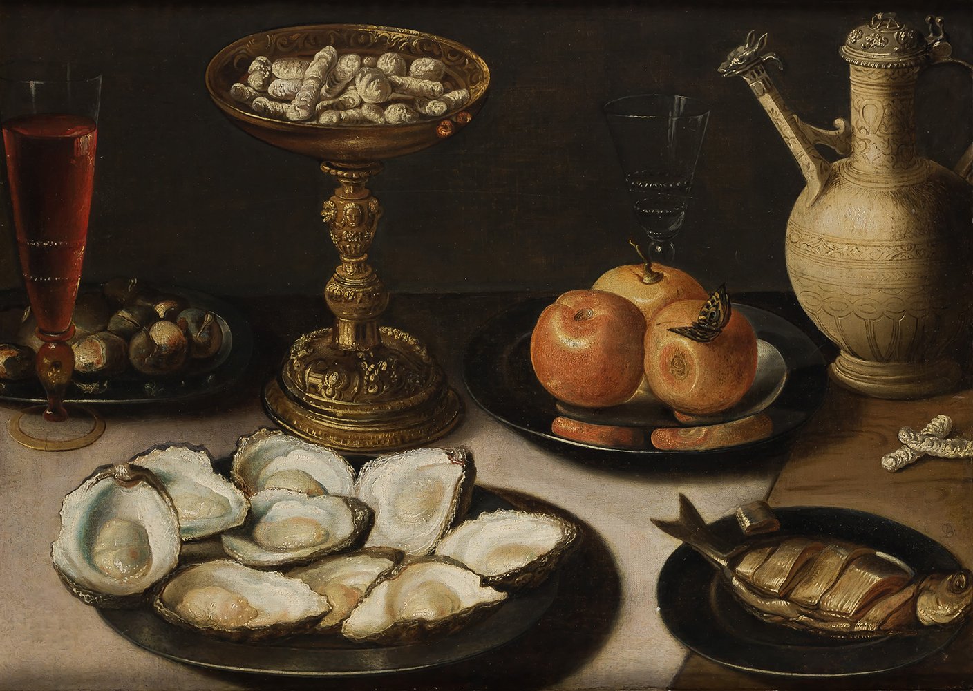 8 Osias Beert I, Naturaleza muerta con platos de ostras, frutas y arenques, copa con dulces, jarra y dos vasos. Remate: 95.000€