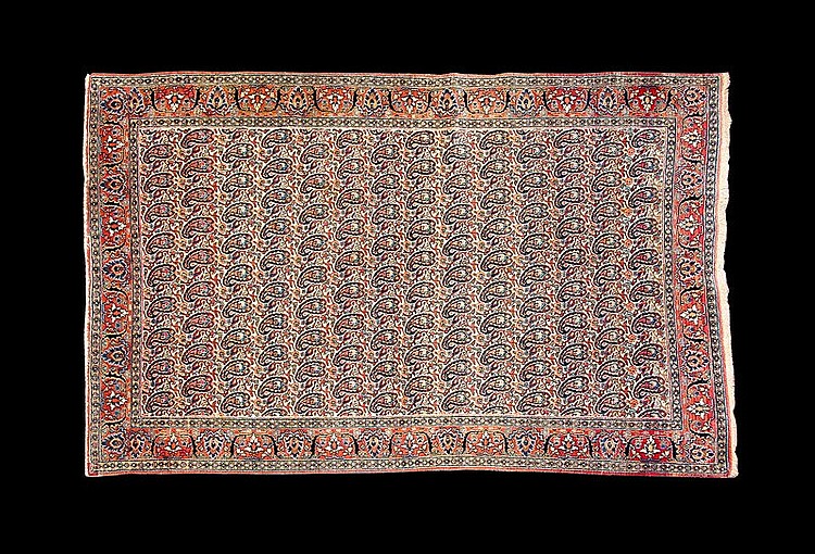 Una de las sorpresas más gratificantes de esta sesión son las alfombras persas que saldrán a subasta, todas de gran calidad. Traemos dos que consideramos que son sumamente interesantes. La primera (185 x 122 cm) está realizada en lana hilada a mano con trama de algodón, procedente de Dorokhsh, región de Khorassam, en Persia, a mediados del siglo XX. El diseño es de almendra floral y palmas sobre un campo en color crema claro, incluyendo después tonos como el índigo, el rojo, azul oscuro, marrón o verde. Esta región es nombrada habitualmente precisamente por sus alfombras, dedicándose en gran medida a la creación y exportación de alfombras persas a Europa. El arabesco que presenta es muy decorativo, y tiene vástagos en espiral y bandas de guarda en pequeña escala. Sale a subasta por 4.250€ (ver).