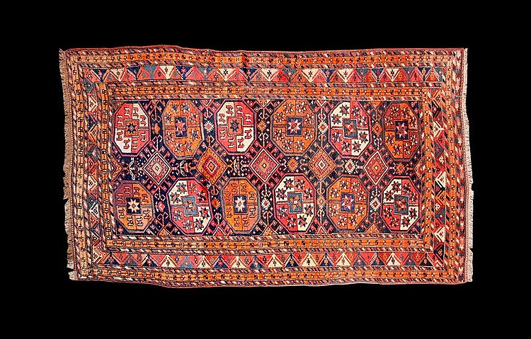 La segunda alfombra a destacar (287 x 160 cm) es Lury,  de lana, con hilos de urdimbre, y procede de Ghouchan, una región al noreste de Persia. Pertenece al segundo cuarto del siglo XX. El diseño es de doce medallones octagonales de gran tamaño, con cuatro medallones grandes decorados con motivos de perro, simbolizando así protección, defensa y confianza, y cinco medallones más pequeños en el campo central. El octagón gul tiene ocho puntas, dado que es un número de buena suerte en Asia Central y China. Los colores, como en la anterior, son muy naturales, índigo, marrón, crema,… Ghouchan, por su parte, es una ciudad pequeña y pertenece a Khorasan. Las alfombras mantienen las influencias de Turkmenistán y Afganistán. Saldrá a subasta por 2.250€ (ver).