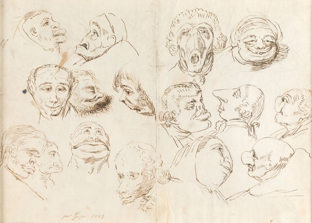 - FRANCISCO DE GOYA Y LUCIENTES “DIECISÉIS CABEZAS CARICATURESCAS Y AUTORRETRATO DE GOYA”, H. 1797-98 1746 / 1828 PLUMA SEPIA Y LÁPIZ NEGRO SOBRE PAPEL VERJURADO 30 X 41 CM