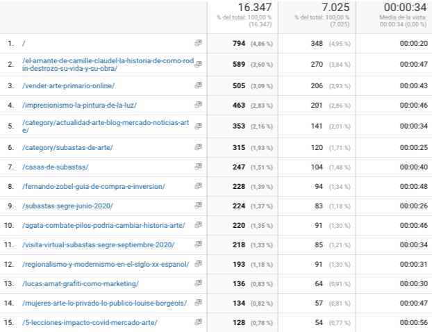 En cuanto a las páginas que recibieron más tráfico, después de la página central, Home, destacan los artículos “El amante de Camile Claudel”, “Vender arte primario online”, “Impresionismo”, nuestra sección de noticias sobre subastas de arte, la página directorio “Casas de Subastas, “Visita Virtual Segre septiembre 2020”.