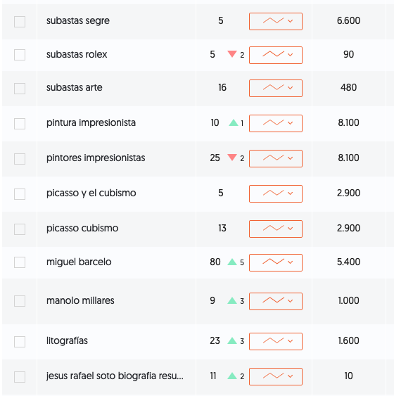 Además de lo anterior, TheArtMarket, consigue tráfico desde su posicionamiento en Google (y otros buscadores) con palabras clave como “Subastas de arte”, “Subastas de rolex”, “Subastas Segre”, “Pintura Impresionista”, “Picasso y el Cubismo”, “Manolo Millares…”En los próximos meses iremos actualizando y ampliando información.