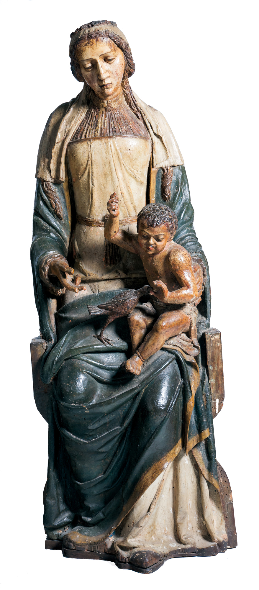 - Virgen sentada con el Niño, escultura en madera tallada, policromada y dorada
