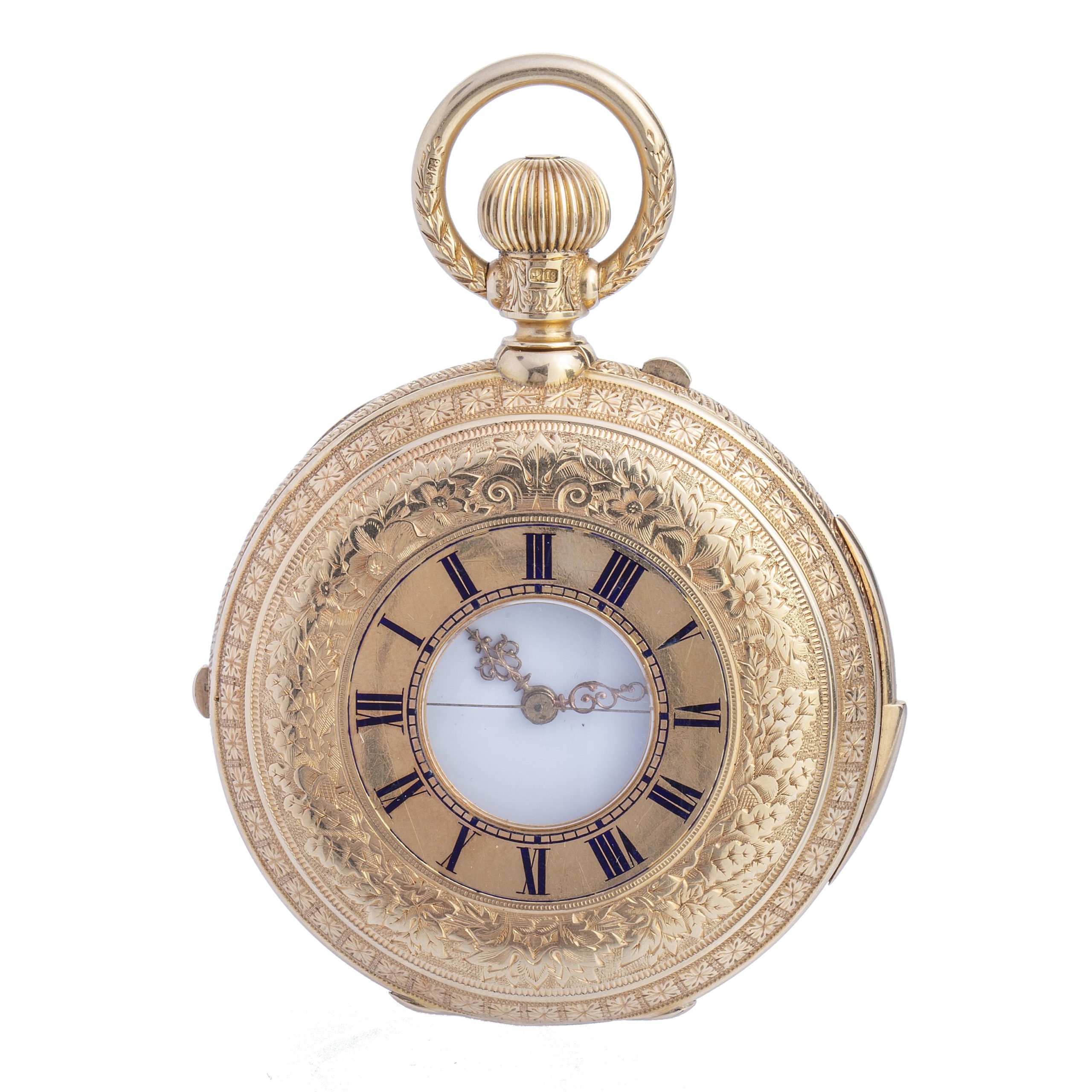 Con el 142, se ofrece otro reloj de bolsillo inglés perteneciente al presidente uruguayo Máximo Santos (1847-1889). Esfera esmaltada en color blanco, con inscripción “Máximo Santos” en esmalte negro. Máquina con sonería en minutos y cronómetro. Caja en oro 18 K totalmente grabada “hojas, flores, máscaras” y guardas de hojas de roble con bellotas. Diámetro de caja 54 mm. Alto con pendant 78 mm. Tres tapas; la frontal con visor de agujas en cristal y aro con números romanos en esmalte azul; la trasera con monograma “M.S.” en esmalte blanco y azul, con punzón “C.F.” perteneciente al fabricante Charles Frodsham, numeración “15561” y punzones o “english hallmarks” correspondientes (¿Londres 1880?). Peso bruto 143 gr. Funcionando. Presentado en estuche forrado en cuero marrón, con interior de tapa forrado en seda y decorado con cinta bicolor celeste y blanca, con guía para exhibir reloj y cadena (ver lote 143).