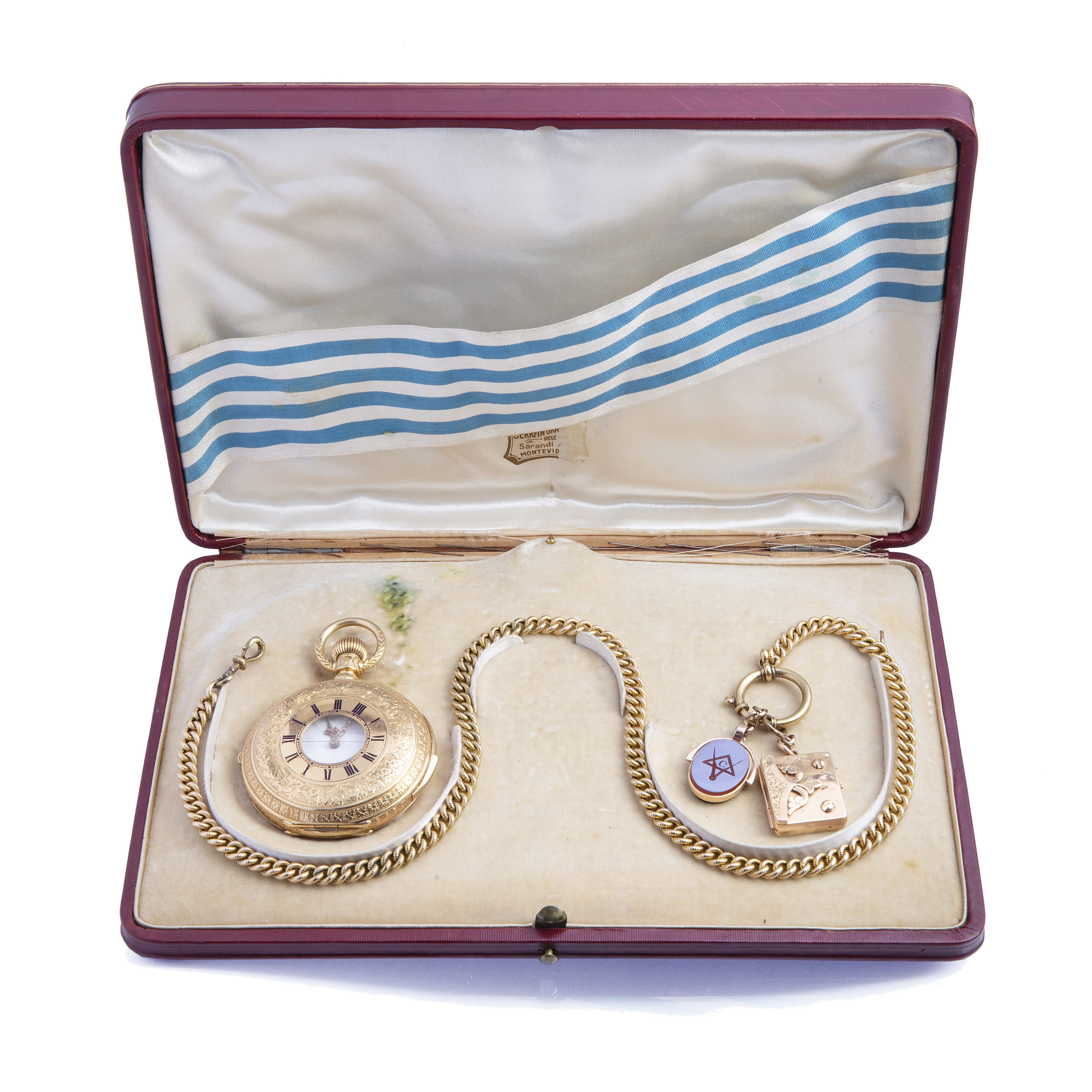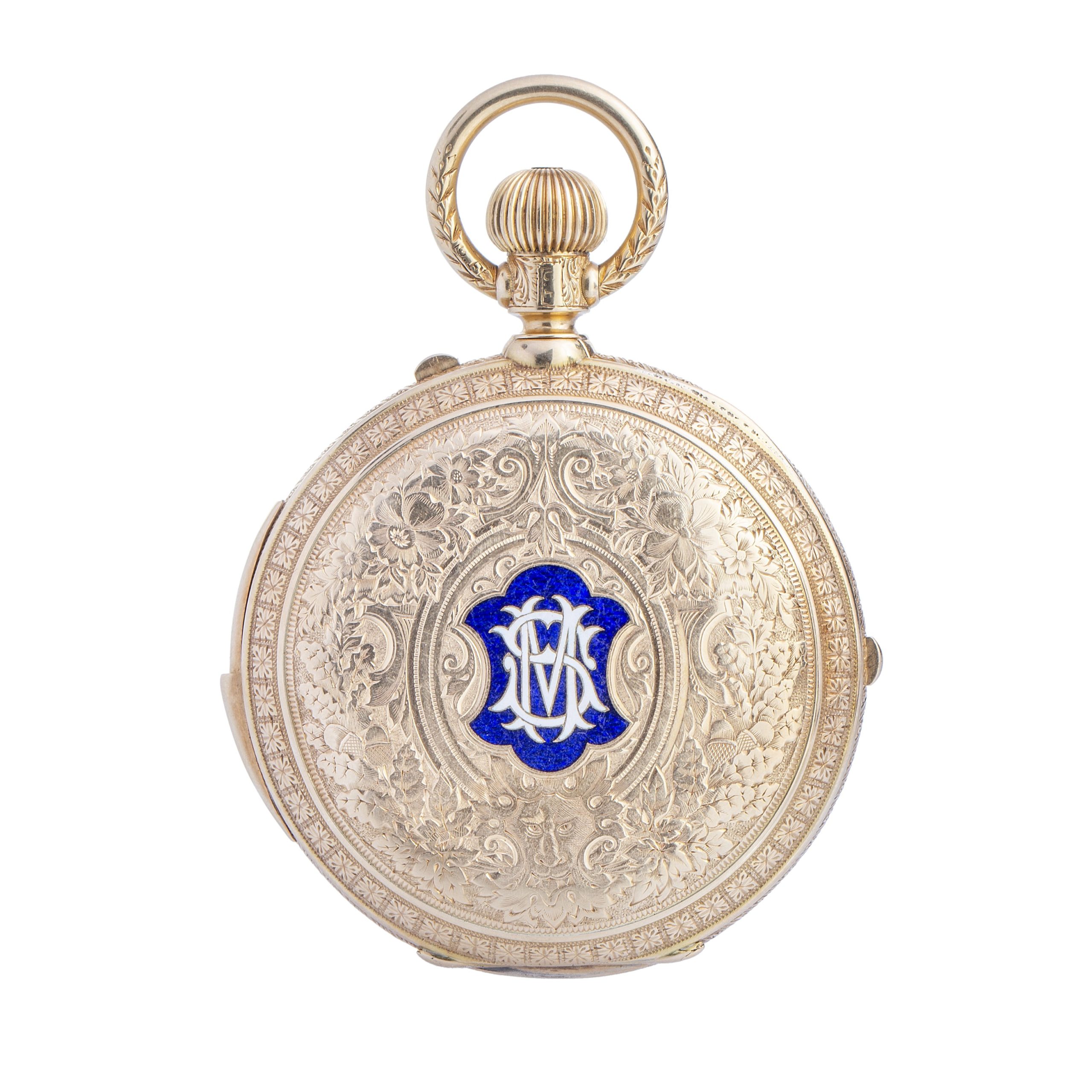 Con el 142, se ofrece otro reloj de bolsillo inglés perteneciente al presidente uruguayo Máximo Santos (1847-1889). Esfera esmaltada en color blanco, con inscripción “Máximo Santos” en esmalte negro. Máquina con sonería en minutos y cronómetro. Caja en oro 18 K totalmente grabada “hojas, flores, máscaras” y guardas de hojas de roble con bellotas. Diámetro de caja 54 mm. Alto con pendant 78 mm. Tres tapas; la frontal con visor de agujas en cristal y aro con números romanos en esmalte azul; la trasera con monograma “M.S.” en esmalte blanco y azul, con punzón “C.F.” perteneciente al fabricante Charles Frodsham, numeración “15561” y punzones o “english hallmarks” correspondientes (¿Londres 1880?). Peso bruto 143 gr. Funcionando. Presentado en estuche forrado en cuero marrón, con interior de tapa forrado en seda y decorado con cinta bicolor celeste y blanca, con guía para exhibir reloj y cadena (ver lote 143).