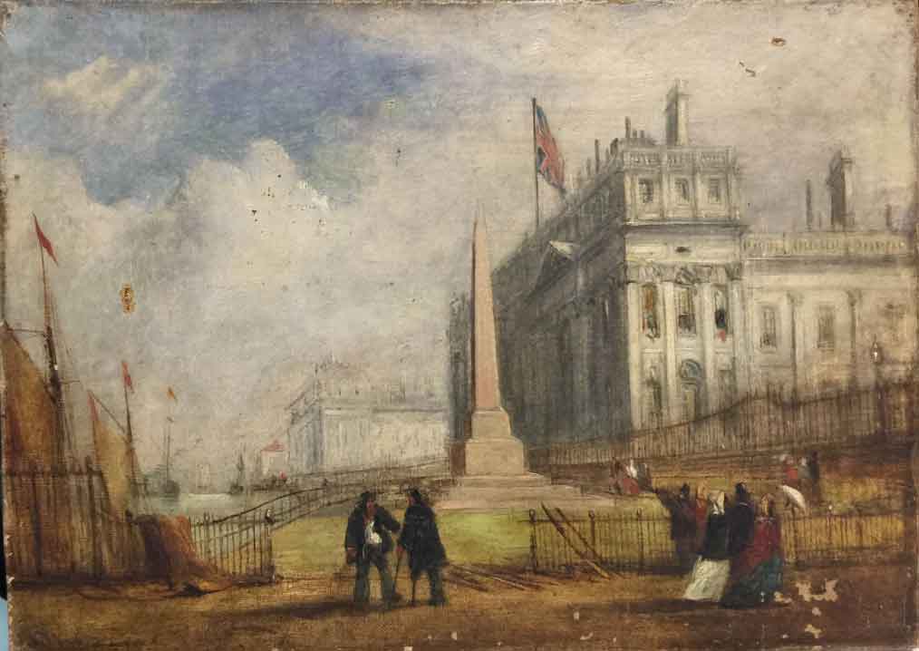 - Paisaje de Londres segunda mitad del siglo XIX, con obelisco de Cleopatra al borde el Támesis con barcos