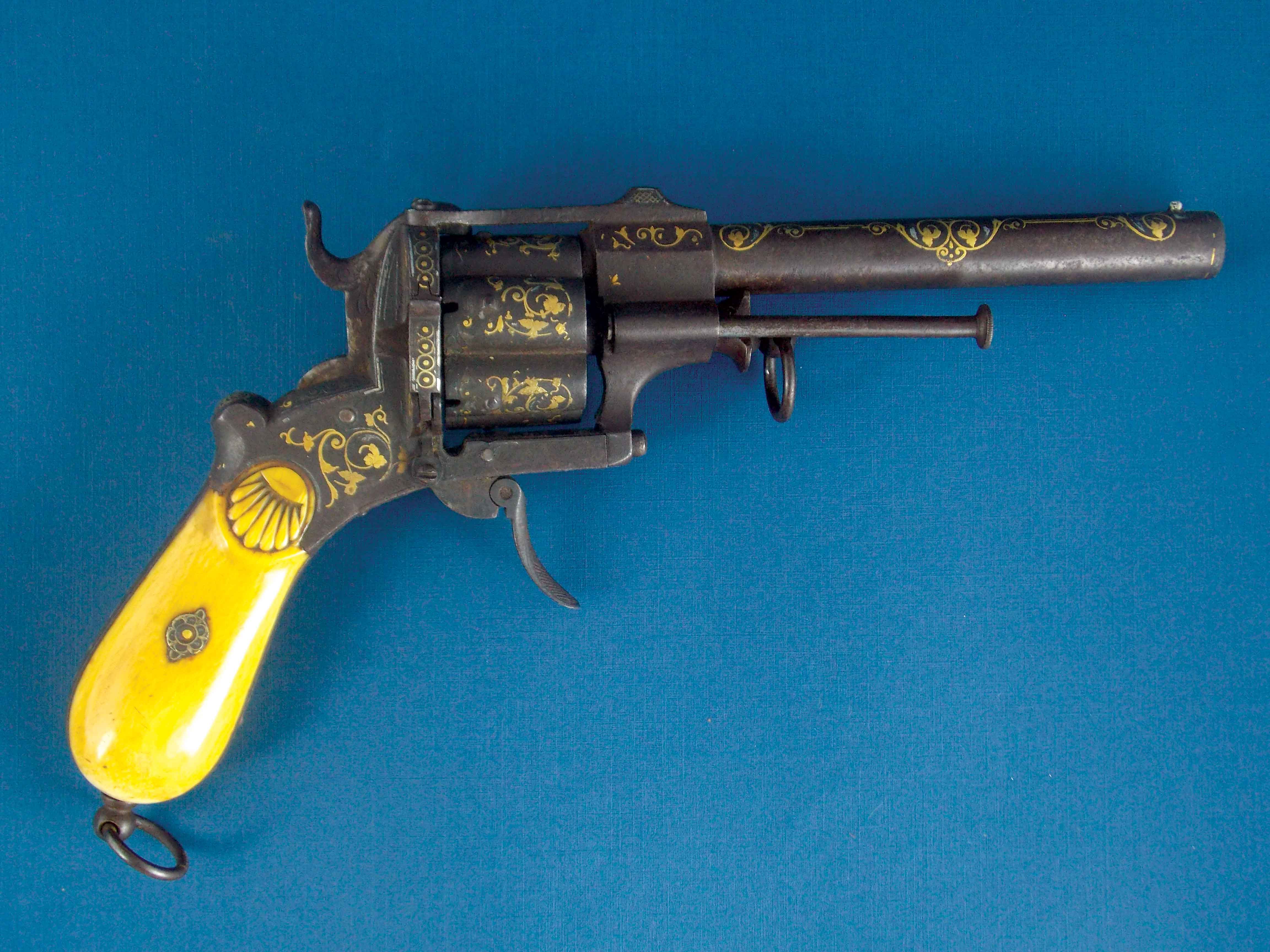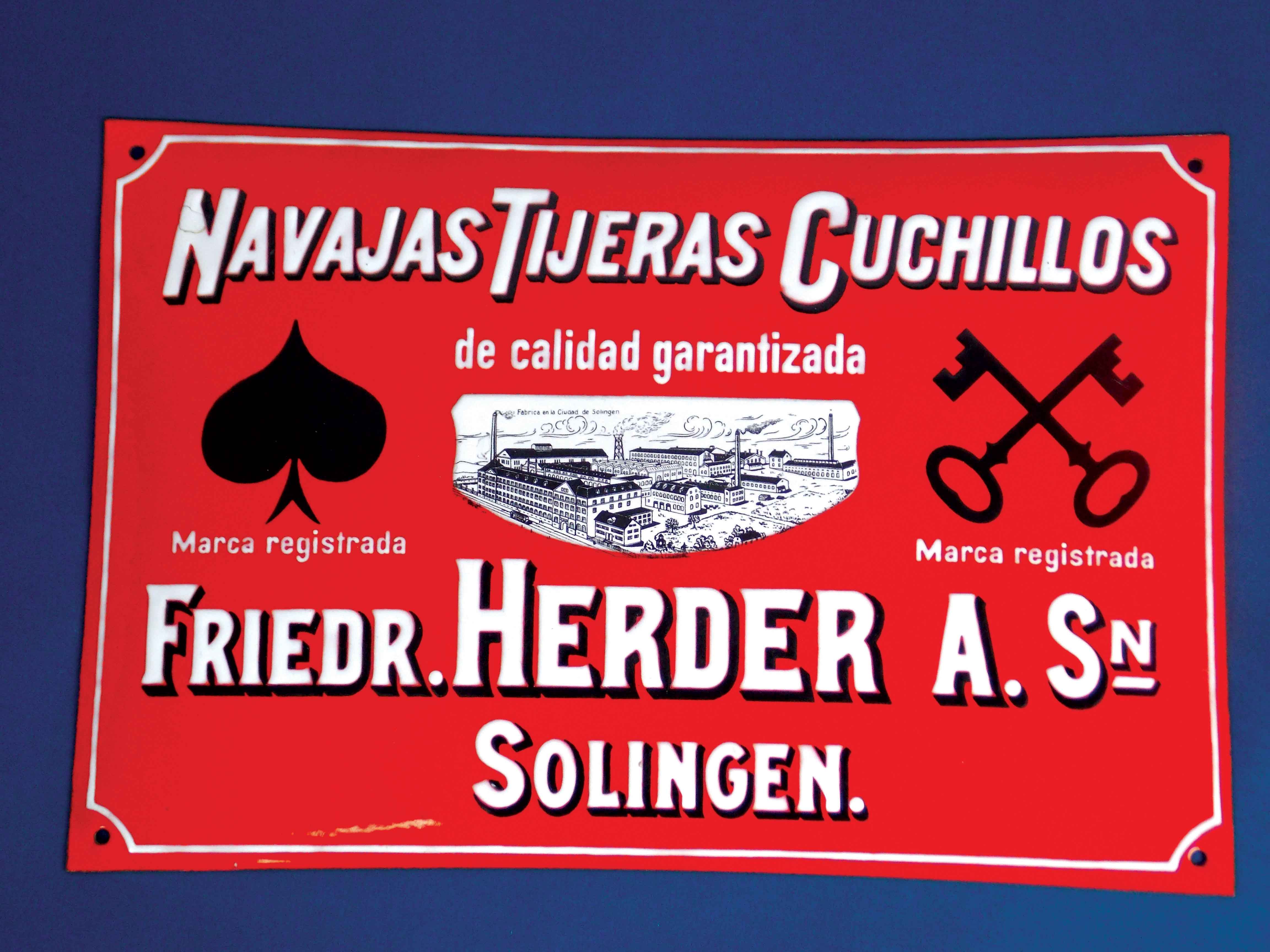 Encontramos también un fino revólver español, de sistema Lefaucheaux, decorado con incrustaciones en plata y otro e inscripción en el caño. Las cachas están realizadas en marfil tallado y el gatillo es retraíble. Le acompaña, en el lote 290, una chapa de hierro esmaltada y rectangular de la fábrica de cuchillos, tijeras y navajas Herder, en Solingen. El fondo es naranja, con letras y dibujos en blanco y negro: posee una pequeña restauración.