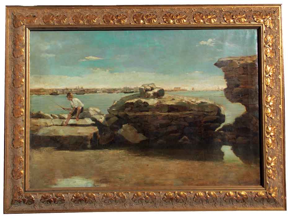 - Vista de Montevideo y su bahía desde la zona de Capurro con ruinas y niño pescando, Grashof