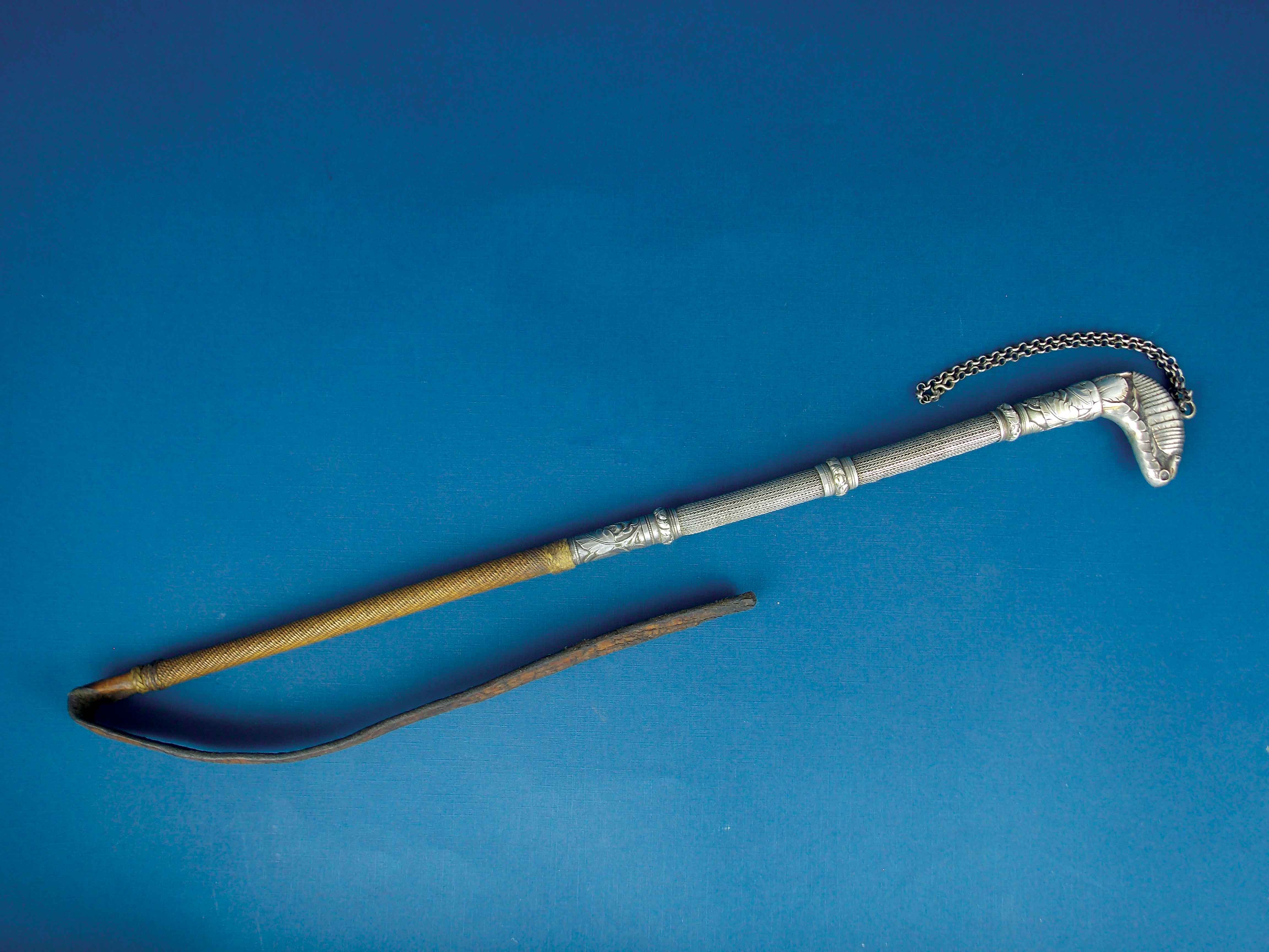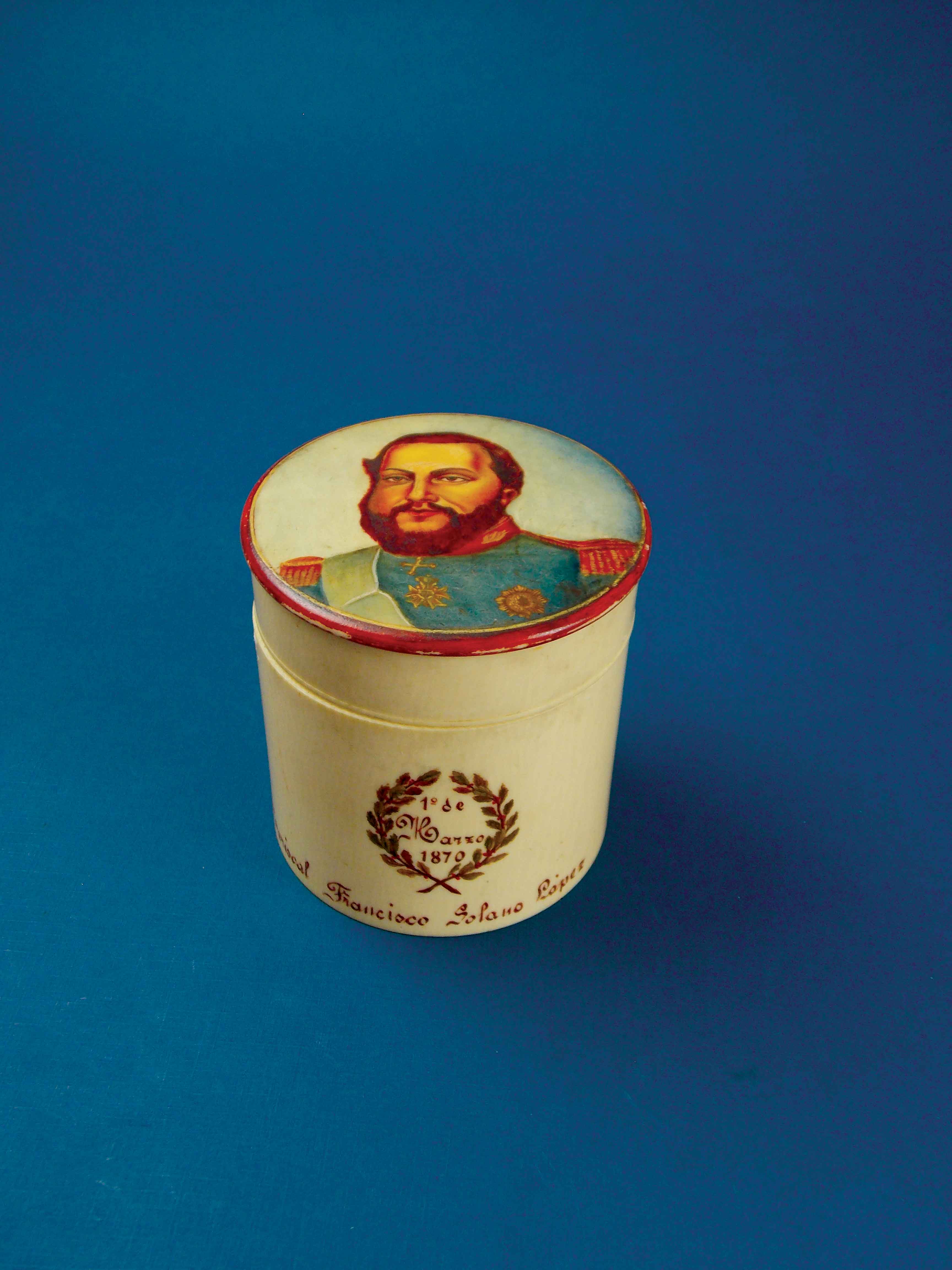 Pasando a otros ámbitos, vemos un par de guampas talladas y decoradas con imágenes de damas, una con ancla y otra con corona de laureles, de 35 cm de alto. También una tabaquera redonda del siglo XIX, en marfil y pintada a mano con dedicatoria al Mariscal Francisco Solano López, del 1 de marzo de 1870. En cuestiones criollas vemos un cuchillo, con hoja de Sol de Broqua y Scholberg, al dorso una D coronada, y el cabo y la vaina en plata y oro cincelados con hojas y flores.