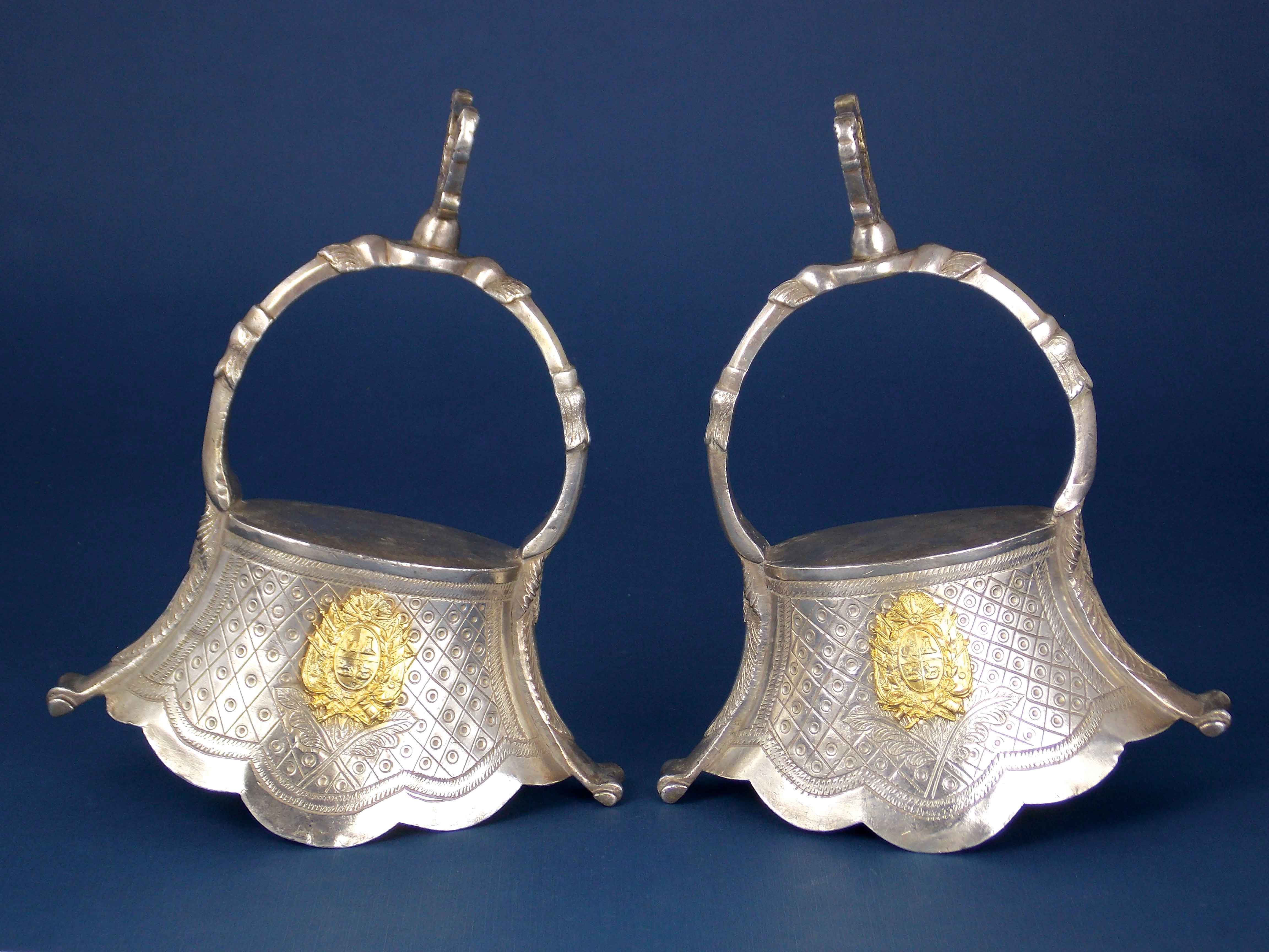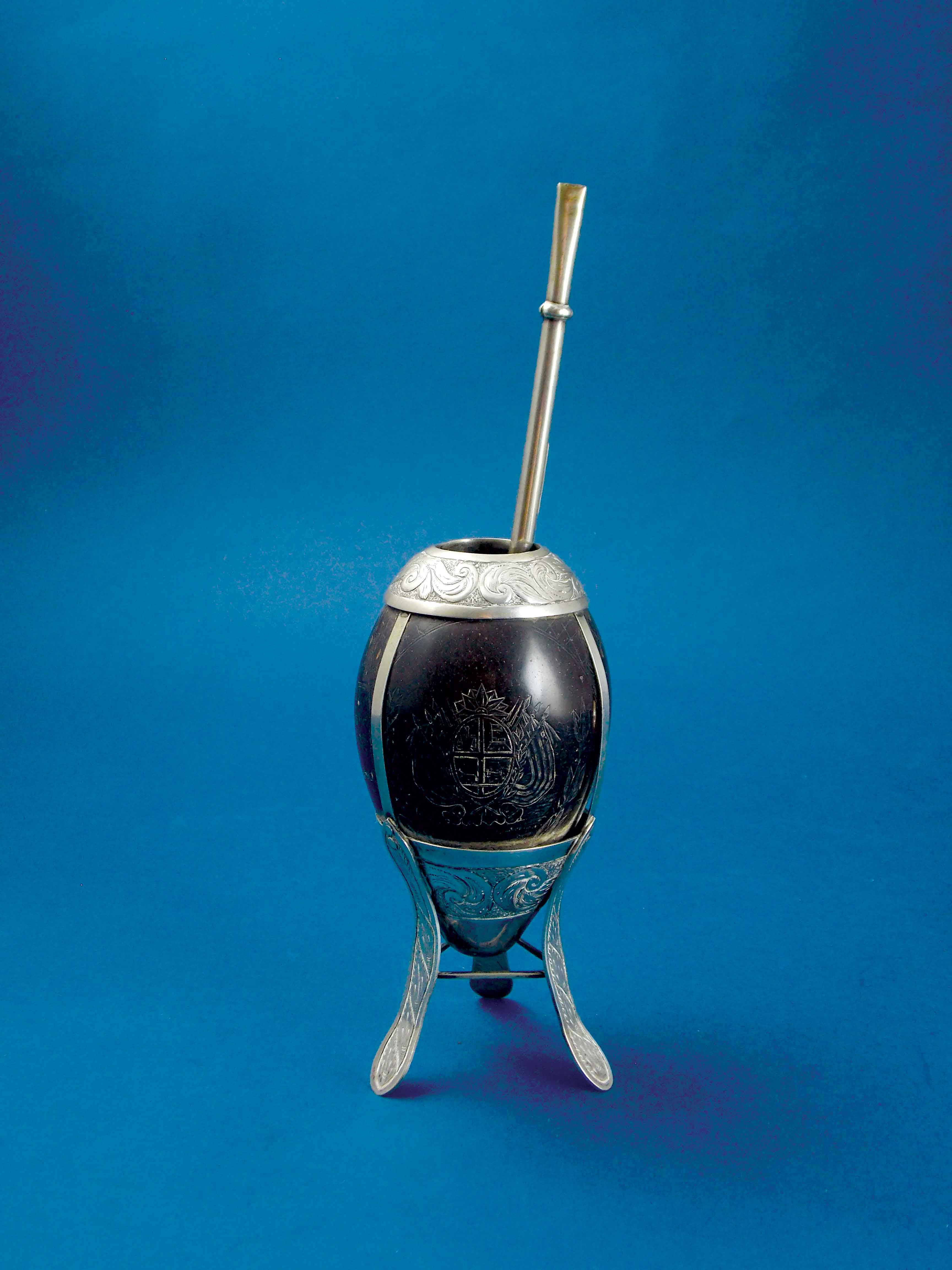 Encontramos también un par de estribos tipo campana en plata cincelada con flores repujadas, con escudo nacional en bronce dorado en ambos lados, y un mate en coco burilado con el escudo nacional uruguayo y una escena de una joven alimentando patos. También posee las iniciales J.P. La virola, las costillas y la base de tres patas están realizadas en plata cincelada, con motivo de hojas.