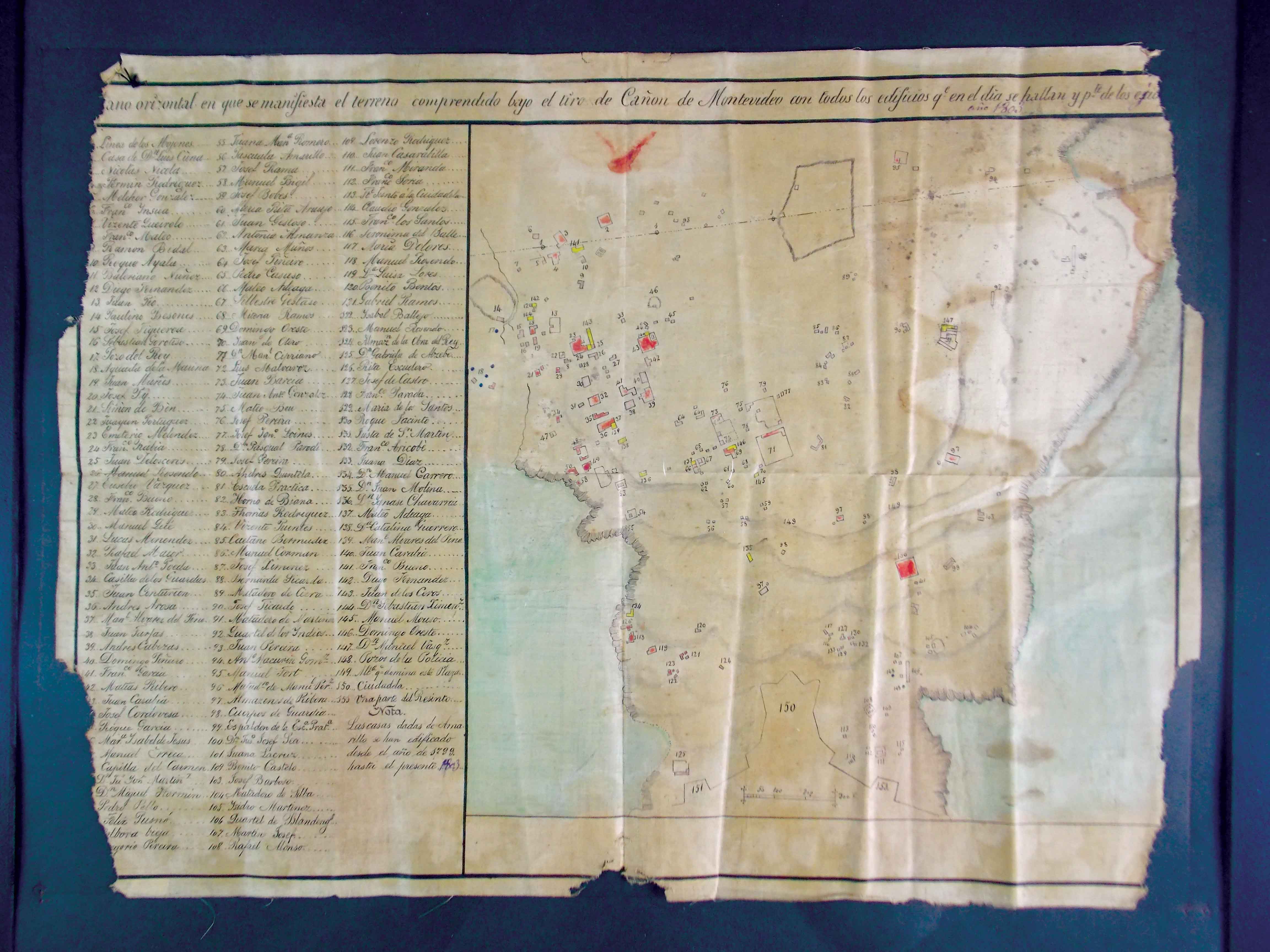 Por último, una fusta forrada en cuero trenzado, con dos secciones en malla de plata, dos pasadores y un pomo cincelado con hojas y flores, y en el lote 545, un plano colonial histórico dibujado y coloreado a mano, acerca de las construcciones existentes fuera de las murallas en la Ciudadela de Montevideo, hasta la línea del Ejido en 1803. Titulado: “Plano orizontal en que se manifiesta el terreno comprendido bajo el tiro de cañón de Montevideo con todos los edificios que en el día se hallan, y Pte. de los ejidos”. Las construcciones se enumeran con el nombre del propietario del uso que se le daba a nivel público. Con nota: “Las casas dadas de amarillo se han edificado desde el año de 1799 hasta el presente de 1803”.
